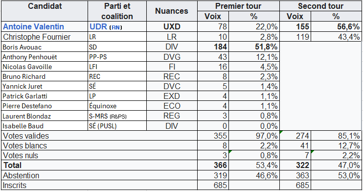 Monsieur Antoine Valentin a été élu député de la 3em circonscription de Haute Savoie le dimanche 1er Février 2026. A saint Laurent il a récolté 56,6% des suffrages devant Monsieur Fournier, 43,4%